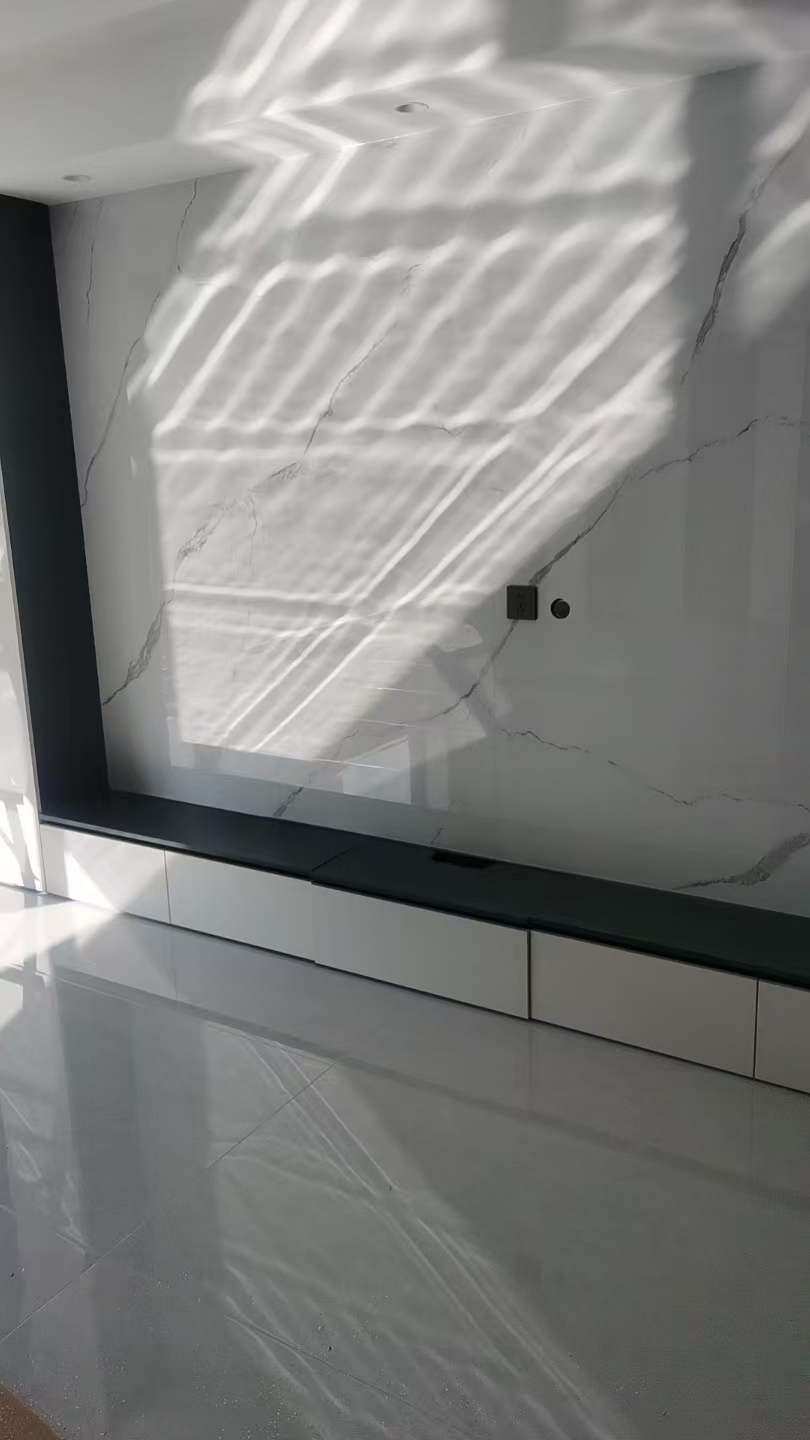 在江山臻境小区,有多户业主选择了朝阳装饰进行装修。如 13#楼 140㎡四室两厅的现代简约风格装修,客餐厅通铺 750×1500 大砖,全屋通缝,双眼皮极简吊顶 + 磁吸轨道灯等设计,效果非常好。南方工人的精工使得阴阳角笔直、瓷砖零空鼓。